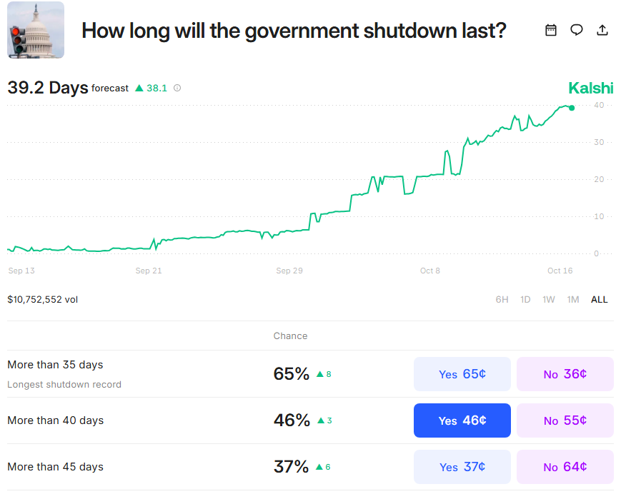 As for the ongoing government shutdown, Kalshi odds now suggest it could drag into November. But there’s one pressure point that could force Trump’s hand: TSA agents. If they start calling in sick like they did in 2019 and airport lines turn into traveler nightmares, he’ll have no choice but to act. The last thing Trump wants heading into year-end is a public meltdown at the airports and his approval rating nosediving alongside it.