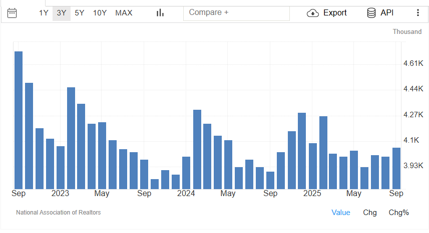 Existing Home Sales- The latest data from the National Association of Realtors for September show existing-home sales climbed to 4.06 million (seasonally adjusted annual rate), marking a 1.5 % monthly gain and a 4.1 % year-over-year increase—lifted by a modest drop in mortgage rates to about 6.27 %. Meanwhile, the median sales price rose to $415,200 (up 2.1 % y/y), inventory remains constrained at roughly 4.6 months’ supply, and the typical home spent just 33 days on market. First-time buyers and all-cash buyers each accounted for about 30 % of transactions. The takeaway: the market is thawing rather than charging forward—lower rates are coaxing some activity back, but affordability pressures and tight inventory mean the housing sector remains more “steady warm” than “white-hot recovery.”