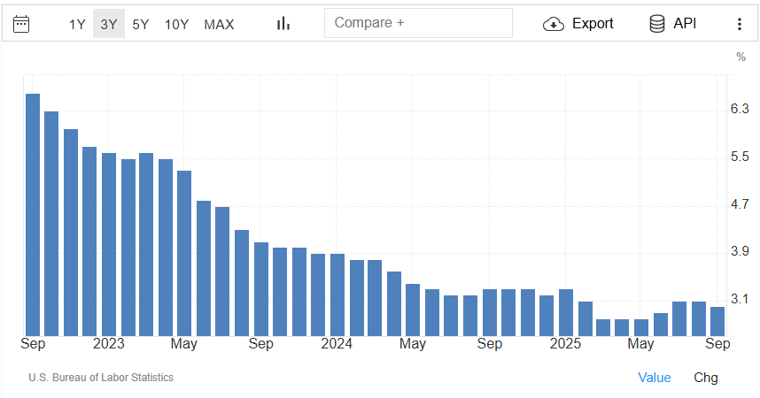 CPI- Headline inflation came in at 3.0% year-over-year in September, a slight uptick from August’s 2.9%, with a monthly rise of 0.3%. Core inflation (excluding food and energy) held steady at 3.0% y/y, marginally down from 3.1%. Gasoline prices surged 4.1% for the month and were a major driver of the headline number, while “owner’s equivalent rent” posted the slowest monthly increase since 2021—providing a mild silver lining.